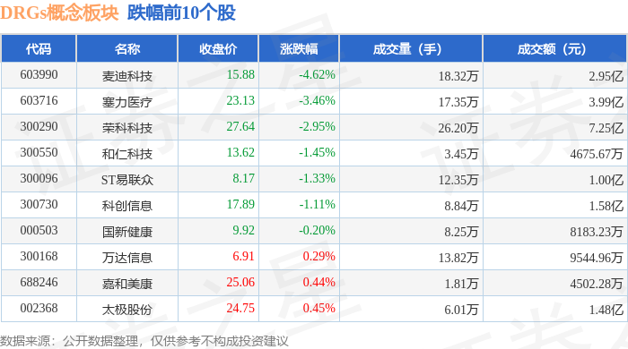 证券之星消息,11月13日DRGs概念板块较上一交易日下跌0.07%,麦迪科技领跌。当日上证指数报收于4029.5,上涨0.73%。深证成指报收于13476.52,上涨1.78%。DRGs概念板块个股涨跌见下表: