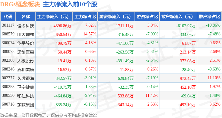 从资金流向上来看,当日DRGs概念板块主力资金净流出2.52亿元,游资资金净流入79.69万元,散户资金净流入2.51亿元。DRGs概念板块个股资金流向见下表: