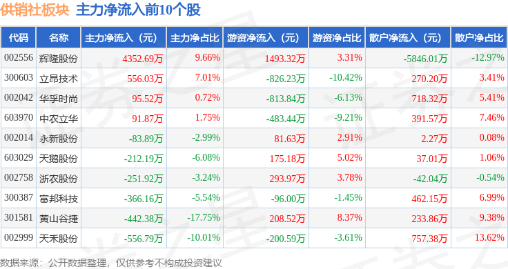 从资金流向上来看,当日供销社板块主力资金净流出9372.67万元,游资资金净流入337.56万元,散户资金净流入9035.11万元。供销社板块个股资金流向见下表: