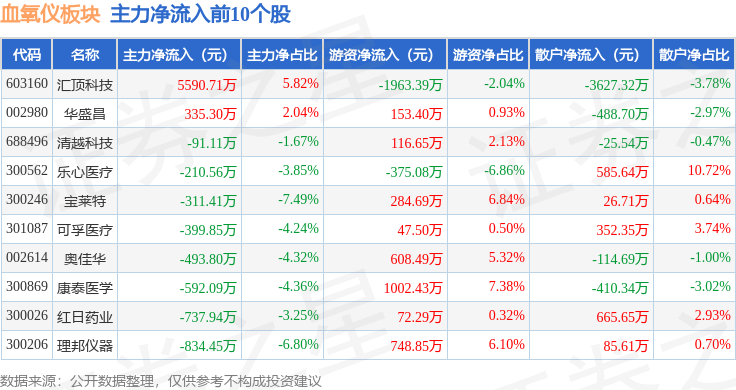 从资金流向上来看,当日血氧仪板块主力资金净流出7128.46万元,游资资金净流出250.91万元,散户资金净流入7379.37万元。血氧仪板块个股资金流向见下表: