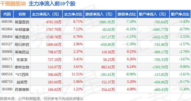 从资金流向上来看,当日干细胞板块主力资金净流出5.05亿元,游资资金净流入1.94亿元,散户资金净流入3.1亿元。干细胞板块个股资金流向见下表: