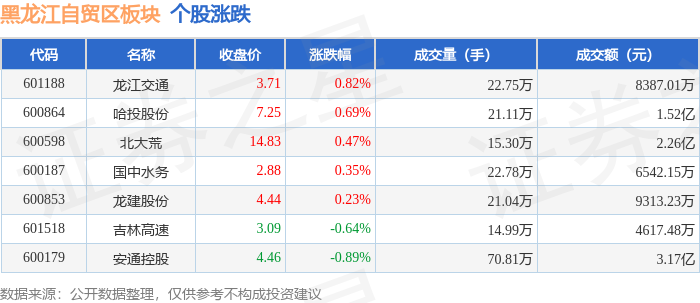 证券之星消息,11月13日黑龙江自贸区板块较上一交易日上涨0.24%,龙江交通领涨。当日上证指数报收于4029.5,上涨0.73%。深证成指报收于13476.52,上涨1.78%。黑龙江自贸区板块个股涨跌见下表: