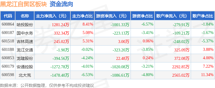 从资金流向上来看,当日黑龙江自贸区板块主力资金净流出1289.04万元,游资资金净流出3628.87万元,散户资金净流入4917.91万元。黑龙江自贸区板块个股资金流向见下表: