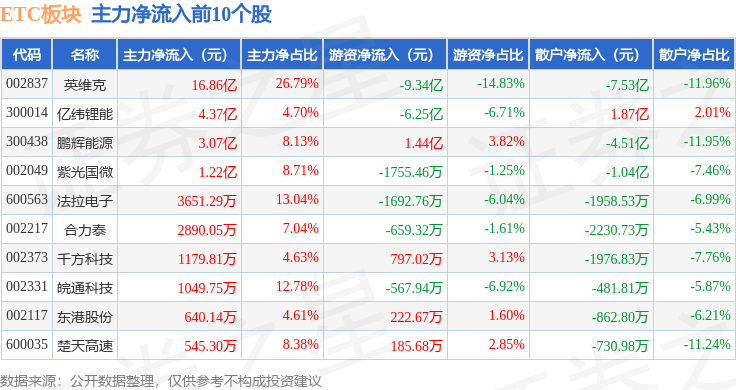 从资金流向上来看,当日ETC板块主力资金净流入23.36亿元,游资资金净流出14.95亿元,散户资金净流出8.41亿元。ETC板块个股资金流向见下表: