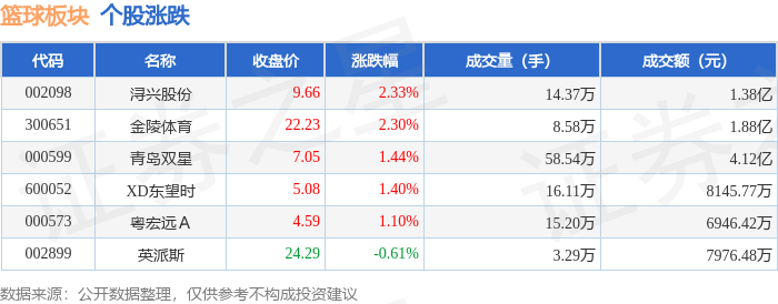 证券之星消息,11月13日篮球板块较上一交易日上涨1.18%,浔兴股份领涨。当日上证指数报收于4029.5,上涨0.73%。深证成指报收于13476.52,上涨1.78%。篮球板块个股涨跌见下表: