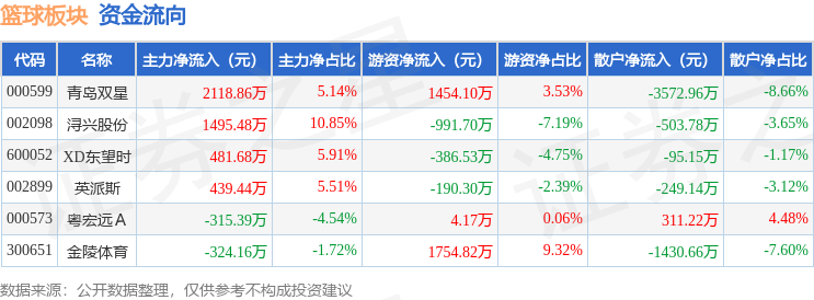 从资金流向上来看,当日篮球板块主力资金净流入3895.92万元,游资资金净流入1644.55万元,散户资金净流出5540.47万元。篮球板块个股资金流向见下表: