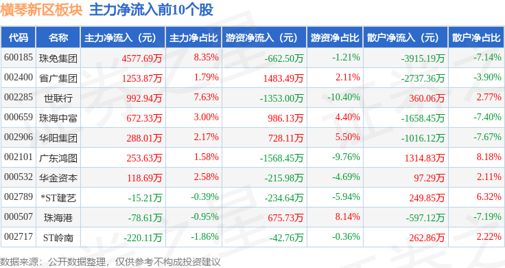 从资金流向上来看,当日横琴新区板块主力资金净流出1.12亿元,游资资金净流入1397.18万元,散户资金净流入9802.16万元。横琴新区板块个股资金流向见下表:
