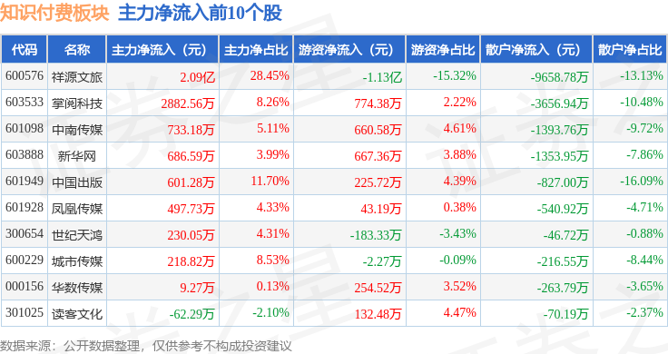从资金流向上来看,当日知识付费板块主力资金净流出2263.89万元,游资资金净流入577.58万元,散户资金净流入1686.31万元。知识付费板块个股资金流向见下表: