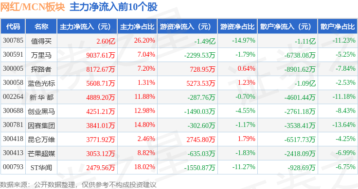 从资金流向上来看,当日网红/MCN板块主力资金净流出9572.17万元,游资资金净流出1.7亿元,散户资金净流入2.66亿元。网红/MCN板块个股资金流向见下表:
