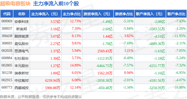 从资金流向上来看,当日超级电容板块主力资金净流入17.86亿元,游资资金净流出6.6亿元,散户资金净流出11.26亿元。超级电容板块个股资金流向见下表: