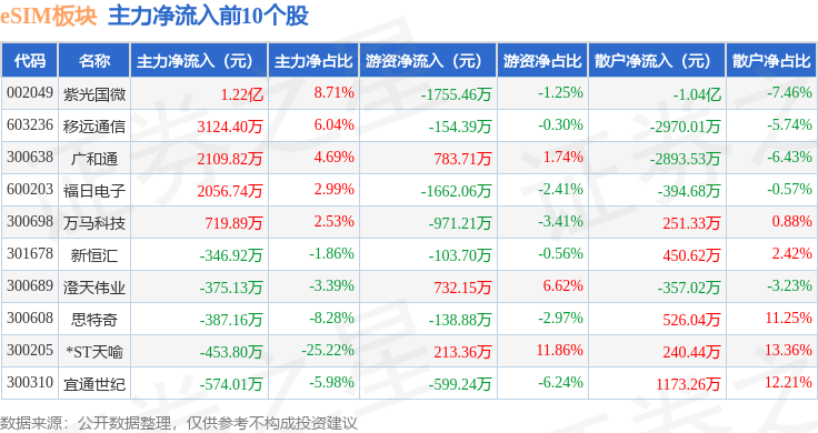 从资金流向上来看,当日eSIM板块主力资金净流入1.45亿元,游资资金净流出7290.68万元,散户资金净流出7184.23万元。eSIM板块个股资金流向见下表: