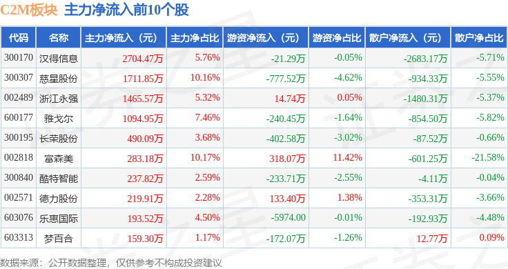 从资金流向上来看,当日C2M板块主力资金净流出2.05亿元,游资资金净流入4651.98万元,散户资金净流入1.59亿元。C2M板块个股资金流向见下表: