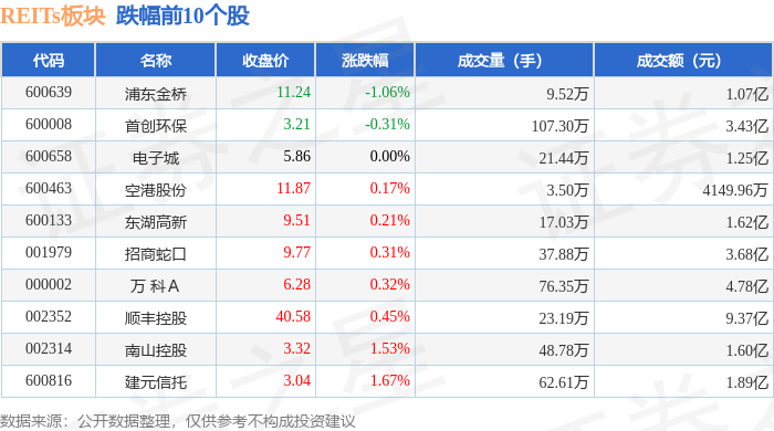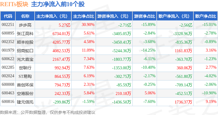 从资金流向上来看,当日REITs板块主力资金净流入6.7亿元,游资资金净流出4.34亿元,散户资金净流出2.36亿元。REITs板块个股资金流向见下表: