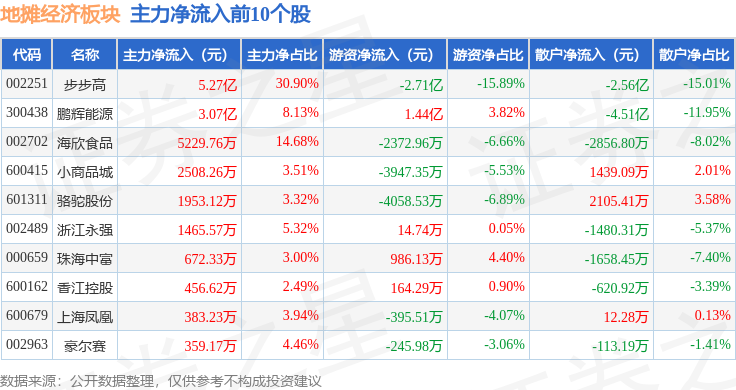 从资金流向上来看,当日地摊经济板块主力资金净流入3.21亿元,游资资金净流出1.14亿元,散户资金净流出2.07亿元。地摊经济板块个股资金流向见下表: