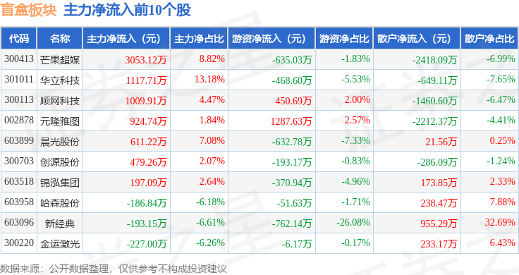 从资金流向上来看,当日盲盒板块主力资金净流出1.49亿元,游资资金净流入8852.03万元,散户资金净流入6006.07万元。盲盒板块个股资金流向见下表: