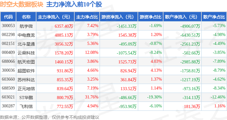 从资金流向上来看,当日时空大数据板块主力资金净流入4144.6万元,游资资金净流入3246.95万元,散户资金净流出7391.55万元。时空大数据板块个股资金流向见下表: