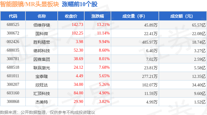 证券之星消息,11月13日智能眼镜/MR头显板块较上一交易日上涨0.0%,佰维存储领涨。当日上证指数报收于4029.5,上涨0.73%。深证成指报收于13476.52,上涨1.78%。智能眼镜/MR头显板块个股涨跌见下表: