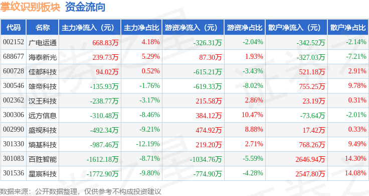 从资金流向上来看,当日掌纹识别板块主力资金净流出4547.49万元,游资资金净流出1989.38万元,散户资金净流入6536.87万元。掌纹识别板块个股资金流向见下表: