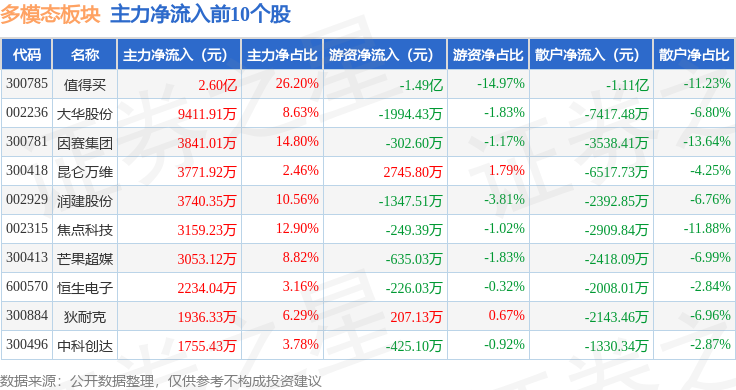 从资金流向上来看,当日多模态板块主力资金净流出1.76亿元,游资资金净流入1432.81万元,散户资金净流入1.62亿元。多模态板块个股资金流向见下表: