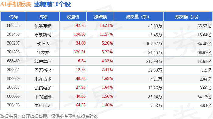 证券之星消息,11月13日AI手机板块较上一交易日上涨1.84%,佰维存储领涨。当日上证指数报收于4029.5,上涨0.73%。深证成指报收于13476.52,上涨1.78%。AI手机板块个股涨跌见下表: