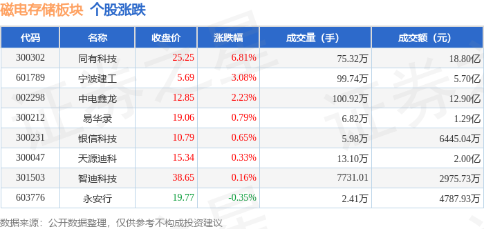 证券之星消息,11月13日磁电存储板块较上一交易日上涨1.97%,同有科技领涨。当日上证指数报收于4029.5,上涨0.73%。深证成指报收于13476.52,上涨1.78%。磁电存储板块个股涨跌见下表: