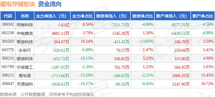 从资金流向上来看,当日磁电存储板块主力资金净流入1.52亿元,游资资金净流出5643.58万元,散户资金净流出9593.36万元。磁电存储板块个股资金流向见下表:
