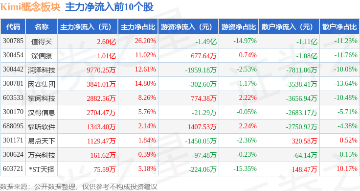 从资金流向上来看,当日Kimi概念板块主力资金净流入3.33亿元,游资资金净流出3683.01万元,散户资金净流出2.96亿元。Kimi概念板块个股资金流向见下表:
