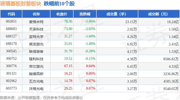 证券之星消息,11月13日玻璃基板封装板块较上一交易日上涨0.8%,海目星领涨。当日上证指数报收于4029.5,上涨0.73%。深证成指报收于13476.52,上涨1.78%。玻璃基板封装板块个股涨跌见下表: