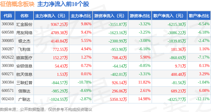 从资金流向上来看,当日征信概念板块主力资金净流入6023.62万元,游资资金净流出1030.0万元,散户资金净流出4993.62万元。征信概念板块个股资金流向见下表: