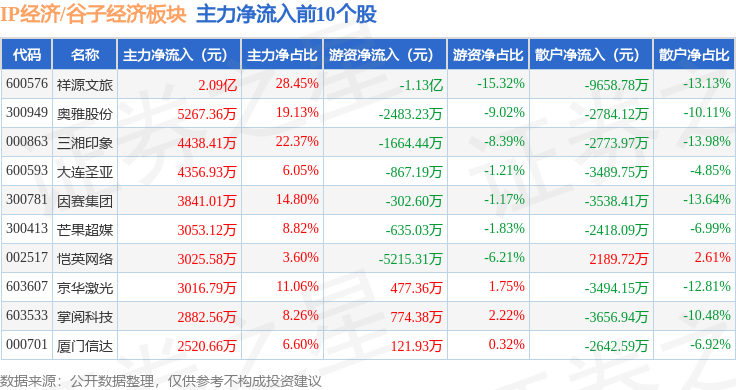 从资金流向上来看,当日IP经济/谷子经济板块主力资金净流出6.05亿元,游资资金净流出2.14亿元,散户资金净流入8.19亿元。IP经济/谷子经济板块个股资金流向见下表: