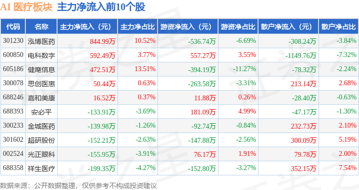 从资金流向上来看,当日AI 医疗板块主力资金净流出2.42亿元,游资资金净流入251.92万元,散户资金净流入2.4亿元。AI 医疗板块个股资金流向见下表: