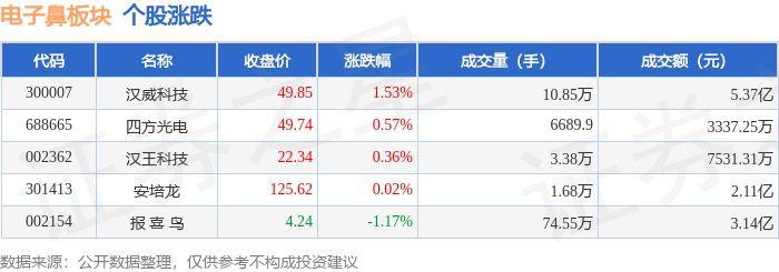 证券之星消息,11月13日电子鼻板块较上一交易日上涨0.56%,汉威科技领涨。当日上证指数报收于4029.5,上涨0.73%。深证成指报收于13476.52,上涨1.78%。电子鼻板块个股涨跌见下表: