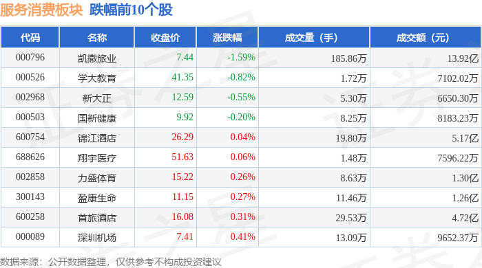证券之星消息,11月13日服务消费板块较上一交易日上涨1.12%,众信旅游领涨。当日上证指数报收于4029.5,上涨0.73%。深证成指报收于13476.52,上涨1.78%。服务消费板块个股涨跌见下表: