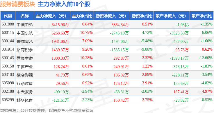 从资金流向上来看,当日服务消费板块主力资金净流出2.43亿元,游资资金净流出249.46万元,散户资金净流入2.45亿元。服务消费板块个股资金流向见下表: