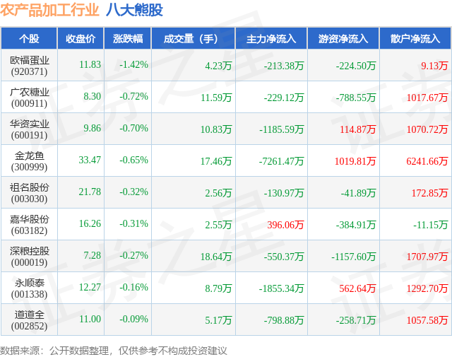 个股表现方面,农产品加工行业当日领跌股为欧福蛋业(920371),该股当日报收11.83,下跌1.42%,成交量4.23万,主力资金净流出213.38万元。广农糖业(000911)以下跌0.72%紧随其后,该股当日成交量11.59万,主力资金净流出229.12万元。除此之外,华资实业(600191)、金龙鱼(300999)、祖名股份(003030)均进入当日熊股之列。具体个股列表见下表: