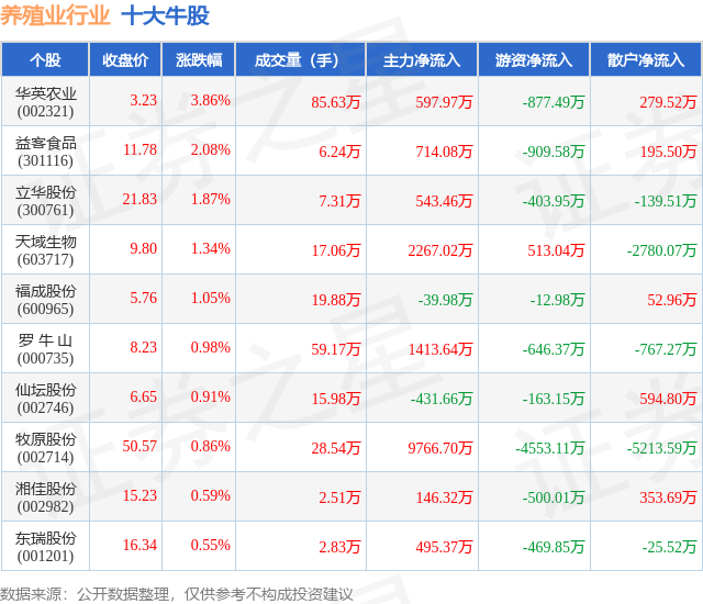 个股表现方面,养殖业行业当日领涨股为华英农业(002321),该股当日报收3.23,上涨3.86%,成交量85.63万,主力资金净流入597.97万元。益客食品(301116)以上涨2.08%紧随其后,该股当日成交量6.24万,主力资金净流入714.08万元。除此之外,立华股份(300761)、天域生物(603717)、福成股份(600965)均进入当日牛股之列。具体个股列表见下表: