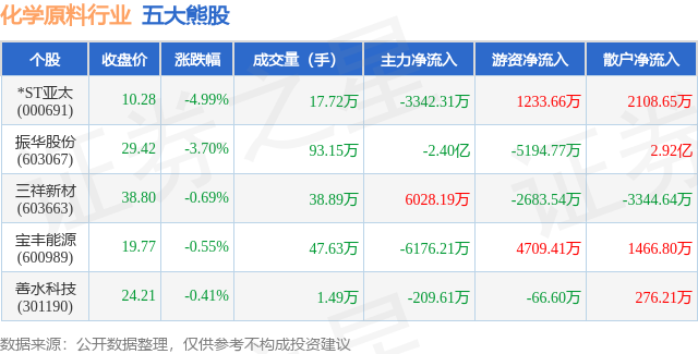 个股表现方面,化学原料行业当日领跌股为*ST亚太(000691),该股当日报收10.28,下跌4.99%,成交量17.72万,主力资金净流出3342.31万元。振华股份(603067)以下跌3.7%紧随其后,该股当日成交量93.15万,主力资金净流出2.4亿元。除此之外,三祥新材(603663)、宝丰能源(600989)、善水科技(301190)均进入当日熊股之列。具体个股列表见下表: