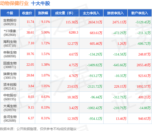 个股表现方面,动物保健行业当日领涨股为生物股份(600201),该股当日报收11.74,上涨9.11%,成交量115.3万,主力资金净流入2654.31万元。*ST绿康(002868)以上涨5.0%紧随其后,该股当日成交量6280.0,主力资金净流入683.61万元。除此之外,海利生物(603718)、申联生物(688098)、回盛生物(300871)均进入当日牛股之列。具体个股列表见下表: