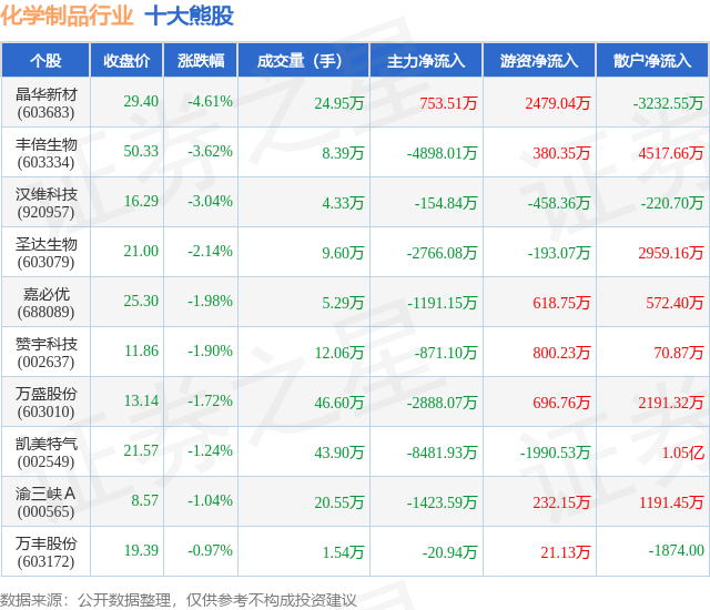 个股表现方面,化学制品行业当日领跌股为晶华新材(603683),该股当日报收29.4,下跌4.61%,成交量24.95万,主力资金净流入753.51万元。丰倍生物(603334)以下跌3.62%紧随其后,该股当日成交量8.39万,主力资金净流出4898.01万元。除此之外,汉维科技(920957)、圣达生物(603079)、嘉必优(688089)均进入当日熊股之列。具体个股列表见下表: