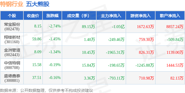 个股表现方面,特钢行业当日领跌股为常宝股份(002478),该股当日报收8.15,下跌2.74%,成交量89.15万,主力资金净流出1.05亿元。翔楼新材(301160)以下跌1.45%紧随其后,该股当日成交量1.4万,主力资金净流出249.46万元。除此之外,金洲管道(002443)、中信特钢(000708)、盛德鑫泰(300881)均进入当日熊股之列。具体个股列表见下表: