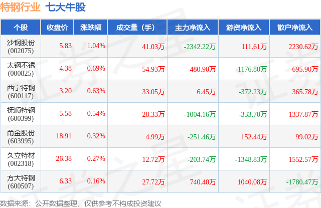 个股表现方面,特钢行业当日领涨股为沙钢股份(002075),该股当日报收5.83,上涨1.04%,成交量41.03万,主力资金净流出2342.22万元。太钢不锈(000825)以上涨0.69%紧随其后,该股当日成交量54.93万,主力资金净流入480.9万元。除此之外,西宁特钢(600117)、抚顺特钢(600399)、甬金股份(603995)均进入当日牛股之列。具体个股列表见下表: