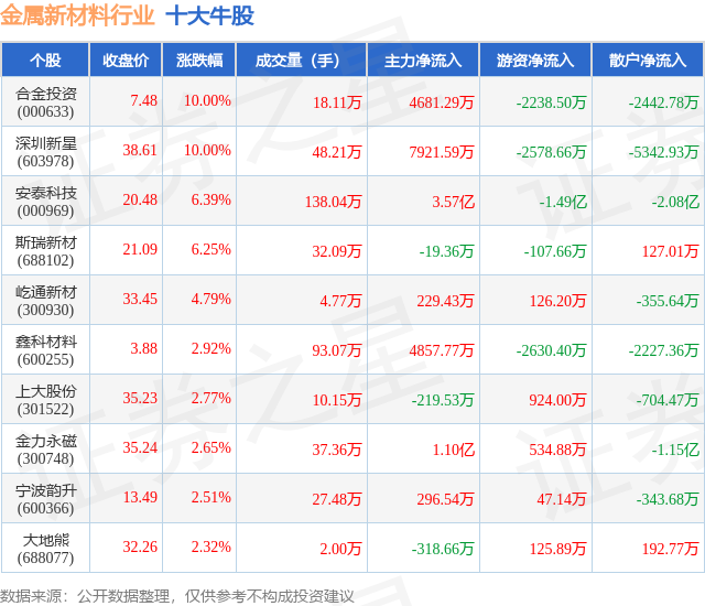 个股表现方面,金属新材料行业当日领涨股为合金投资(000633),该股当日报收7.48,上涨10.0%,成交量18.11万,主力资金净流入4681.29万元。深圳新星(603978)以上涨10.0%紧随其后,该股当日成交量48.21万,主力资金净流入7921.59万元。除此之外,安泰科技(000969)、斯瑞新材(688102)、屹通新材(300930)均进入当日牛股之列。具体个股列表见下表: