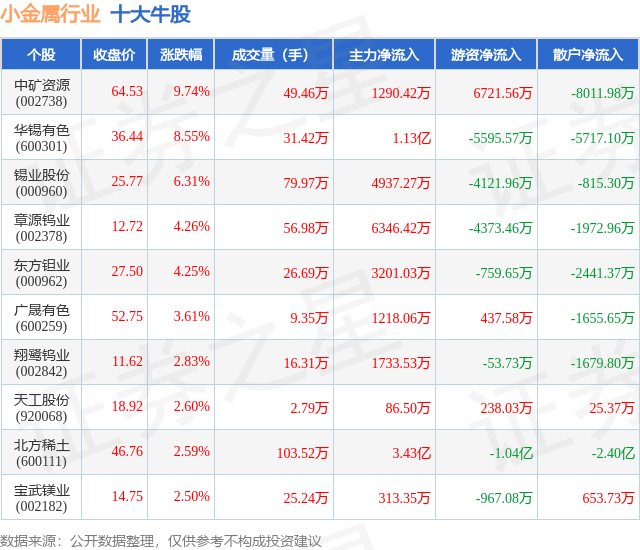 个股表现方面,小金属行业当日领涨股为中矿资源(002738),该股当日报收64.53,上涨9.74%,成交量49.46万,主力资金净流入1290.42万元。华锡有色(600301)以上涨8.55%紧随其后,该股当日成交量31.42万,主力资金净流入1.13亿元。除此之外,锡业股份(000960)、章源钨业(002378)、东方钽业(000962)均进入当日牛股之列。具体个股列表见下表: