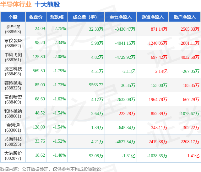 个股表现方面,半导体行业当日领跌股为新相微(688593),该股当日报收24.09,下跌2.75%,成交量32.33万,主力资金净流出3436.47万元。京仪装备(688652)以下跌2.34%紧随其后,该股当日成交量5.98万,主力资金净流出4041.15万元。除此之外,中科飞测(688361)、源杰科技(688498)、赛微微电(688325)均进入当日熊股之列。具体个股列表见下表: