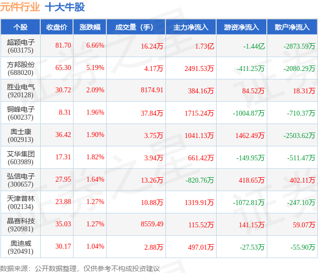 个股表现方面,元件行业当日领涨股为超颖电子(603175),该股当日报收81.7,上涨6.66%,成交量16.24万,主力资金净流入1.73亿元。方邦股份(688020)以上涨5.19%紧随其后,该股当日成交量4.17万,主力资金净流入2491.53万元。除此之外,胜业电气(920128)、铜峰电子(600237)、奥士康(002913)均进入当日牛股之列。具体个股列表见下表: