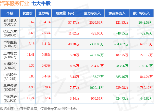 个股表现方面,汽车服务行业当日领涨股为厦门信达(000701),该股当日报收6.67,上涨3.41%,成交量57.47万,主力资金净流入2520.66万元。德众汽车(920030)以上涨2.53%紧随其后,该股当日成交量11.82万,主力资金净流入425.05万元。除此之外,申华控股(600653)、上海物贸(600822)、交运股份(600676)均进入当日牛股之列。具体个股列表见下表: