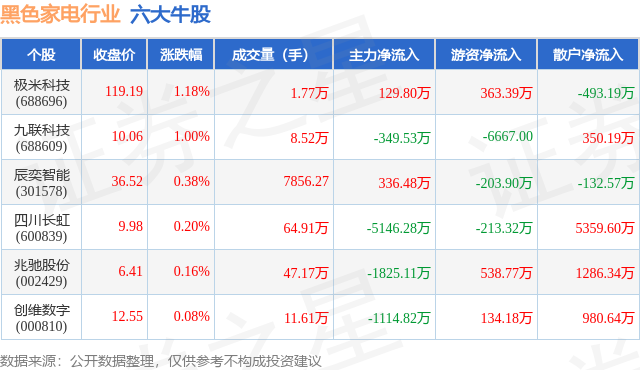 个股表现方面,黑色家电行业当日领涨股为极米科技(688696),该股当日报收119.19,上涨1.18%,成交量1.77万,主力资金净流入129.8万元。九联科技(688609)以上涨1.0%紧随其后,该股当日成交量8.52万,主力资金净流出349.53万元。除此之外,辰奕智能(301578)、四川长虹(600839)、兆驰股份(002429)均进入当日牛股之列。具体个股列表见下表: