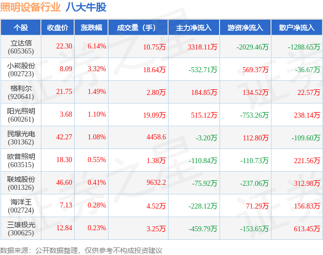 个股表现方面,照明设备行业当日领涨股为立达信(605365),该股当日报收22.3,上涨6.14%,成交量10.75万,主力资金净流入3318.11万元。小崧股份(002723)以上涨3.32%紧随其后,该股当日成交量18.64万,主力资金净流出532.71万元。除此之外,格利尔(920641)、阳光照明(600261)、民爆光电(301362)均进入当日牛股之列。具体个股列表见下表: