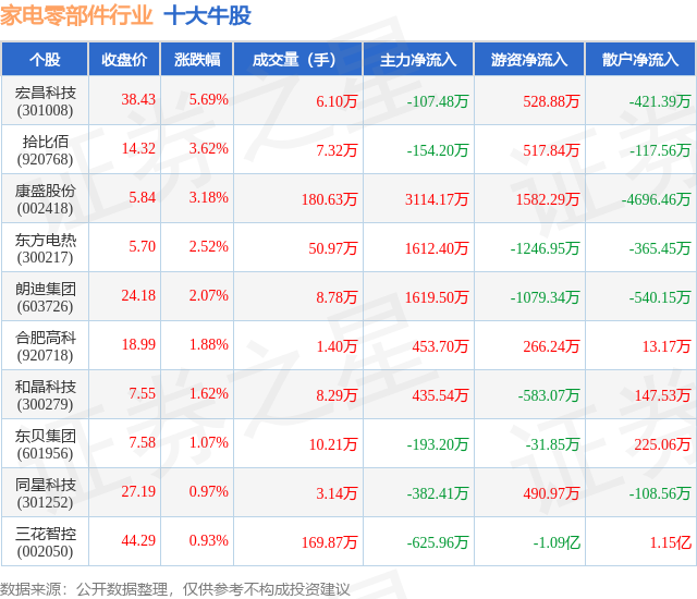 个股表现方面,家电零部件行业当日领涨股为宏昌科技(301008),该股当日报收38.43,上涨5.69%,成交量6.1万,主力资金净流出107.48万元。拾比佰(920768)以上涨3.62%紧随其后,该股当日成交量7.32万,主力资金净流出154.2万元。除此之外,康盛股份(002418)、东方电热(300217)、朗迪集团(603726)均进入当日牛股之列。具体个股列表见下表: