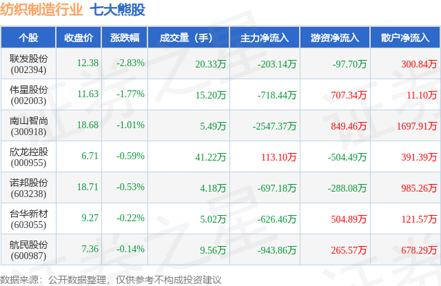 个股表现方面,纺织制造行业当日领跌股为联发股份(002394),该股当日报收12.38,下跌2.83%,成交量20.33万,主力资金净流出203.14万元。伟星股份(002003)以下跌1.77%紧随其后,该股当日成交量15.2万,主力资金净流出718.44万元。除此之外,南山智尚(300918)、欣龙控股(000955)、诺邦股份(603238)均进入当日熊股之列。具体个股列表见下表: